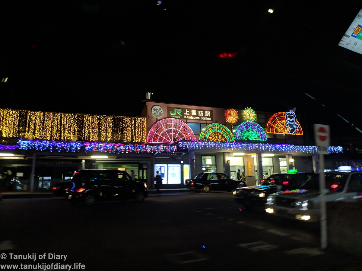 途中通過した上諏訪駅は謎にイルミネーションが付いていた。